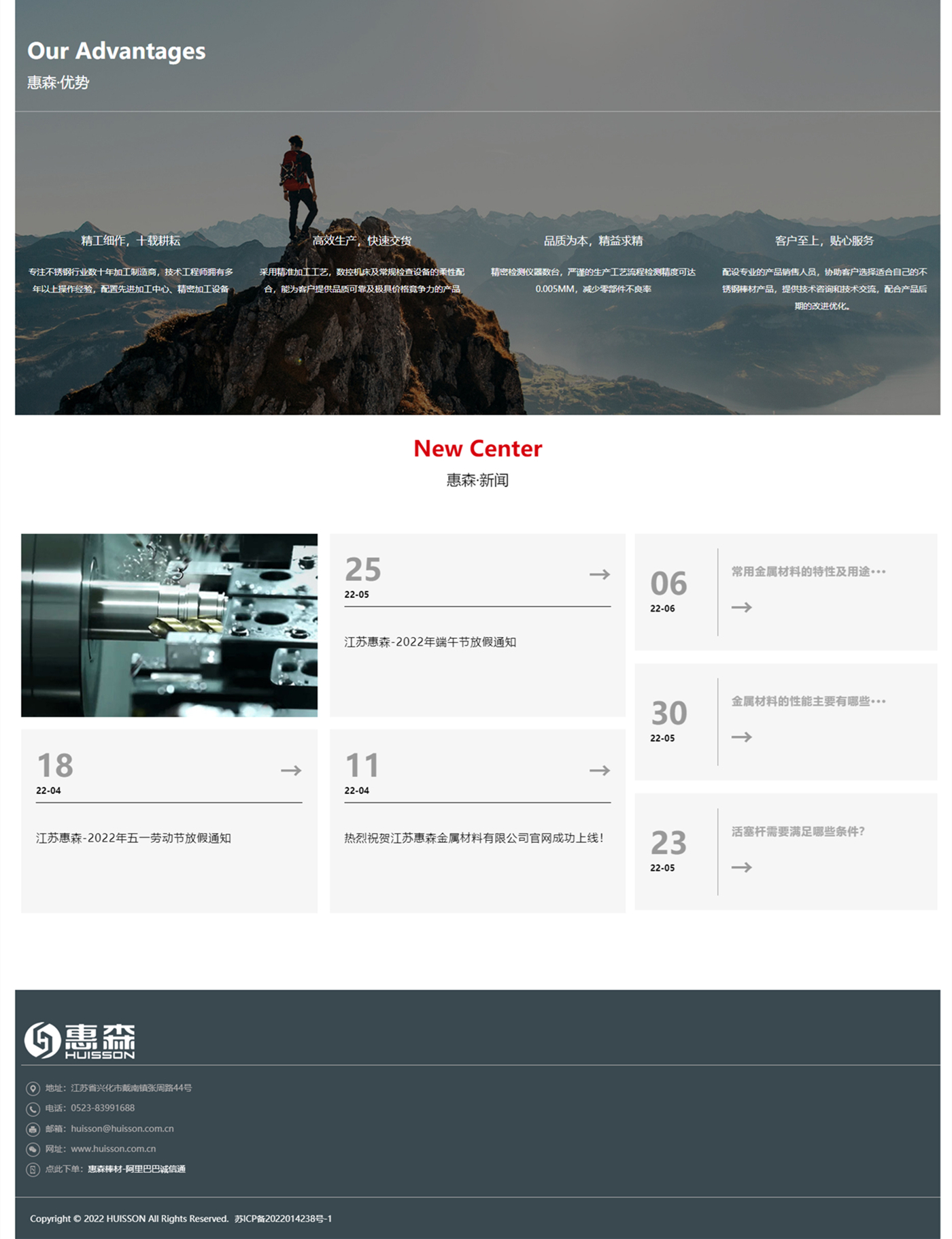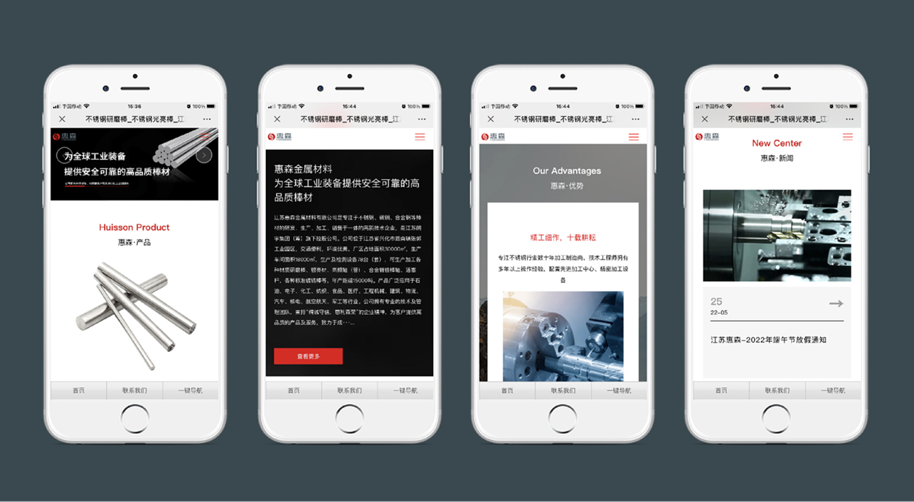 江蘇惠森金屬材料有限公司是專注于不銹鋼、碳鋼、合金鋼等棒材的研發(fā)、生產(chǎn)、加工、銷售于一體的高新技術(shù)企業(yè),是江蘇朗宇集團(tuán)(籌)旗下控股公司。九城科技為江蘇惠森提供了響應(yīng)式網(wǎng)站設(shè)計(jì)及程序開(kāi)發(fā)服務(wù)。